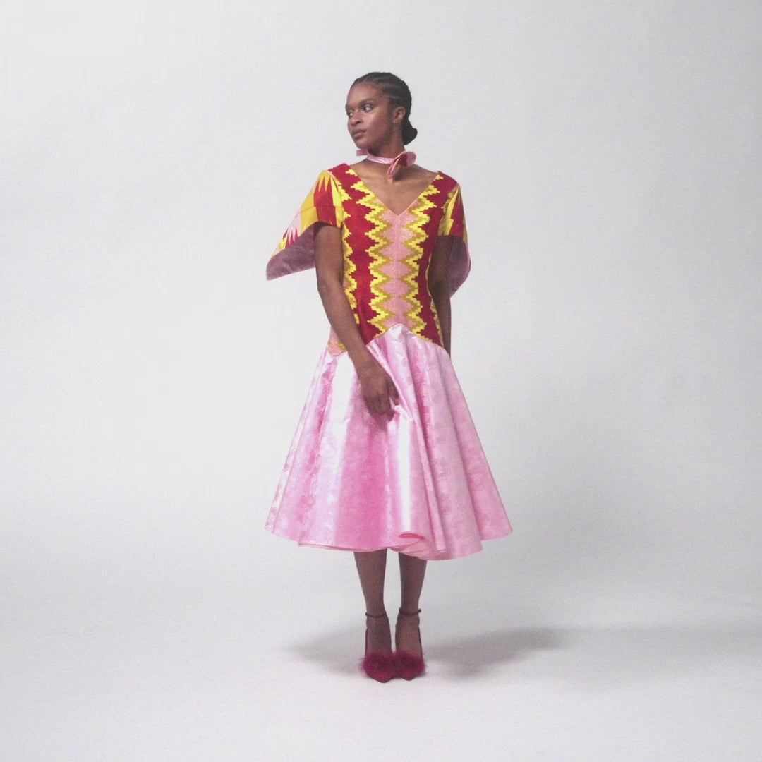 Introducing the "Delaunay Dress", showcased at FLYING SOLO PFW24, a creation that embodies Sonia Delaunay's vision that "Colour is the skin of the world." This piece invites you to be bold, to wear color as a proclamation of your perspective and spirit. Crafted with a meticulous eye for artistic detail, the Delaunay Dress features a vibrant art deco pattern on its upper portion, made from handwoven Kente fabric that captures the essence of visual joy. This is seamlessly paired with a glamorous pink skirt crafted from shiny premium cotton and lined with delicate Organza, combining opulence with a flourish of grace. Structural sleeves add a regal and airy elegance to the upper part of the dress, enhancing the silhouette and emphasizing the wearer's inherent royalty. With the Delaunay Dress, you are invited to embrace and celebrate the empress within, radiating boldness and elegance in every gesture.The design is completed with a decorative flower encircling the neck, adding a final touch of glamour that makes the Delaunay Dress not just an outfit but a statement—perfect for the woman who is ready to show the world her unique style and vibrant personality.