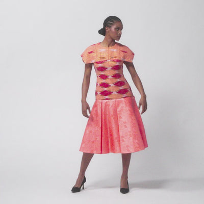 Introducing "The Makeba Dress," unveiled at FLYING SOLO PFW24—an emblem of NAAYÉ BRAHM’s dedication to elegance and artisanal excellence. This dress radiates with the joy and warmth of its vibrant orange hue, complemented by an exquisitely integrated upper cape crafted from handwoven kente cotton, a testament to the traditional techniques preserved by our master weavers. The Makeba Dress is meticulously designed with a pleated skirt crafted from premium shiny cotton, each pleat catching the light to create a luminous effect. Lined with delicate Organza, the skirt flows with a graceful dynamism, ensuring that each movement of the wearer is a declaration of grace and poise. Every element of The Makeba Dress speaks to a commitment to craftsmanship and exclusivity. The fabrics selected for this piece are chosen not only for their unmatched quality but also for their aesthetic beauty, embodying NAAYÉ BRAHM’s philosophy that true luxury lies in the details. The Makeba Dress is more than an outfit—it is an ode to the sophisticated, discerning woman who dresses to tell her story of elegance and refined taste.