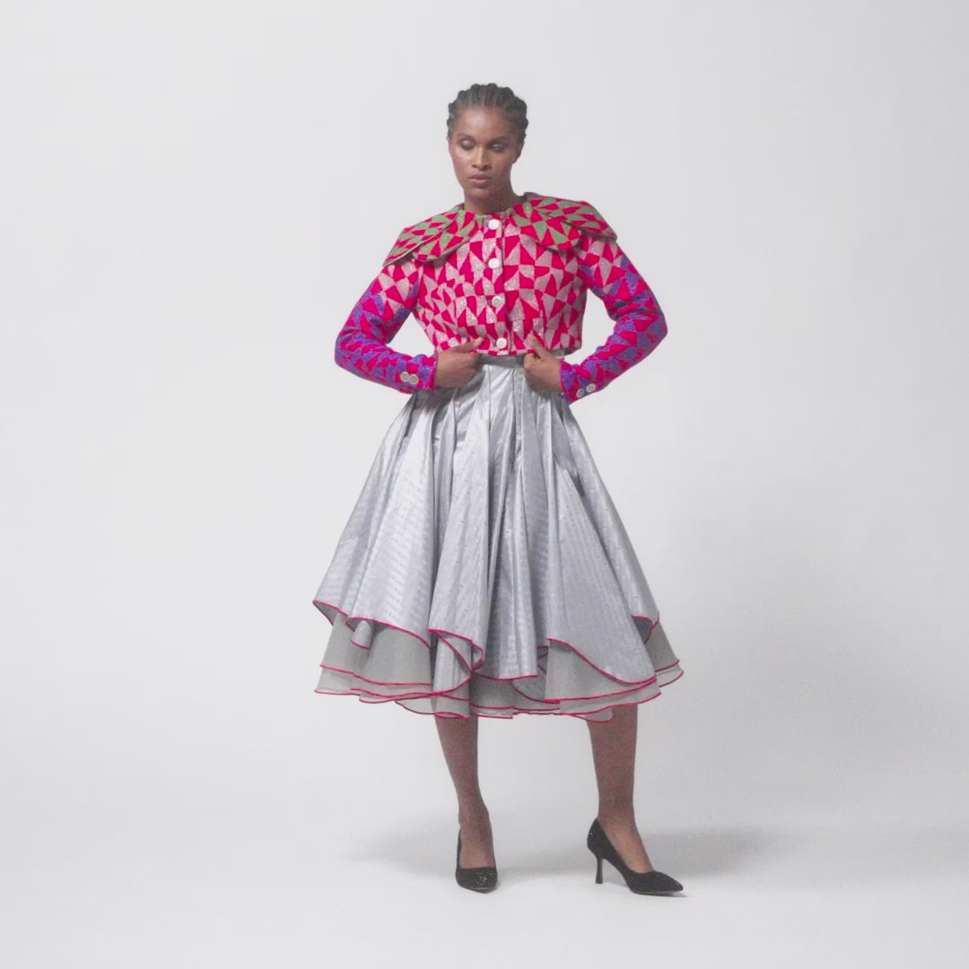 Introducing "The Popova Skirt and Jacket" from NAAYÉ BRAHM, as showcased at FLYING SOLO PFW24. This ensemble draws its daring inspiration from the vibrant heart of Spanish culture, melding the fearless spirit of the bullfighter's "bolero" with the alluring drama of flamenco. The Popova Jacket is a modern homage to traditional Spanish corrida costumes, embodying the audacity of the matadors in its design. It is paired exquisitely with the Popova Skirt, which captures the sensual flow and glamour of flamenco. The skirt is crafted with sumptuous layers of Organza, creating a voluptuous silhouette that gracefully moves with the wearer, finished with striking red accents that command attention. The color palette of both pieces draws from Lioubov Popova's "Painterly Architectonic (still life instruments)," where rhythms of deeply colored, layered planes achieve a structured, dynamic composition. This artistic influence brings an added depth to the ensemble, making it not just a garment but a statement of bold individuality. "The Popova Skirt and Jacket" is an expression of luxury that marries traditional inspiration with contemporary fashion. It is designed for the discerning woman who carries her glamour and boldness not just as an aspect of her wardrobe, but as an integral part of her identity.