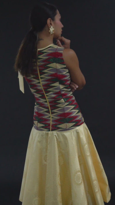 The Yasmina Dress from NAAYÉ BRAHM embodies a blend of regal elegance and graceful artistry, making it an exceptional choice for both day and evening occasions. Crafted with meticulous attention to detail, this dress features hand-woven, vibrant patterns that gracefully accentuate the hips, enhancing its exquisite silhouette. The luxurious, shimmering cape-skirt elegantly drapes to sublimate the figure, creating a breathtaking statement of sophistication and femininity. Adorned with an elegant shoulder tie, the Yasmina Dress adds a touch of glamorous allure. Wearing this masterpiece, you will radiate the essence of elegance and nobility, leaving a lasting impression of timeless beauty.